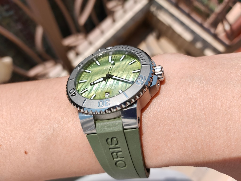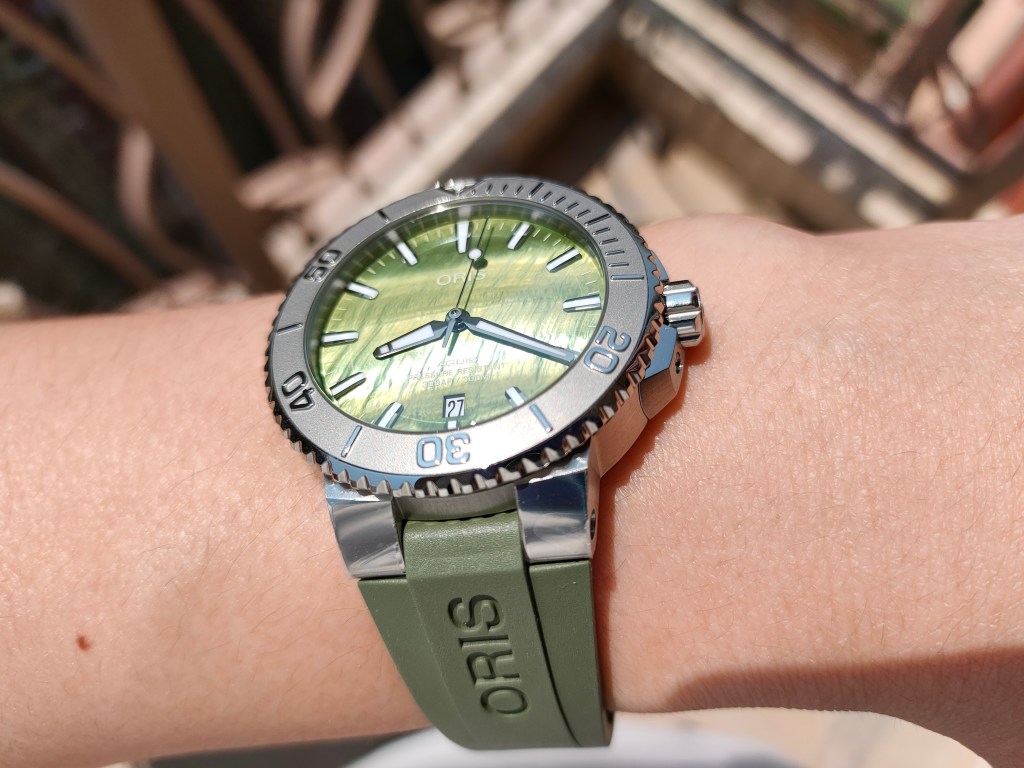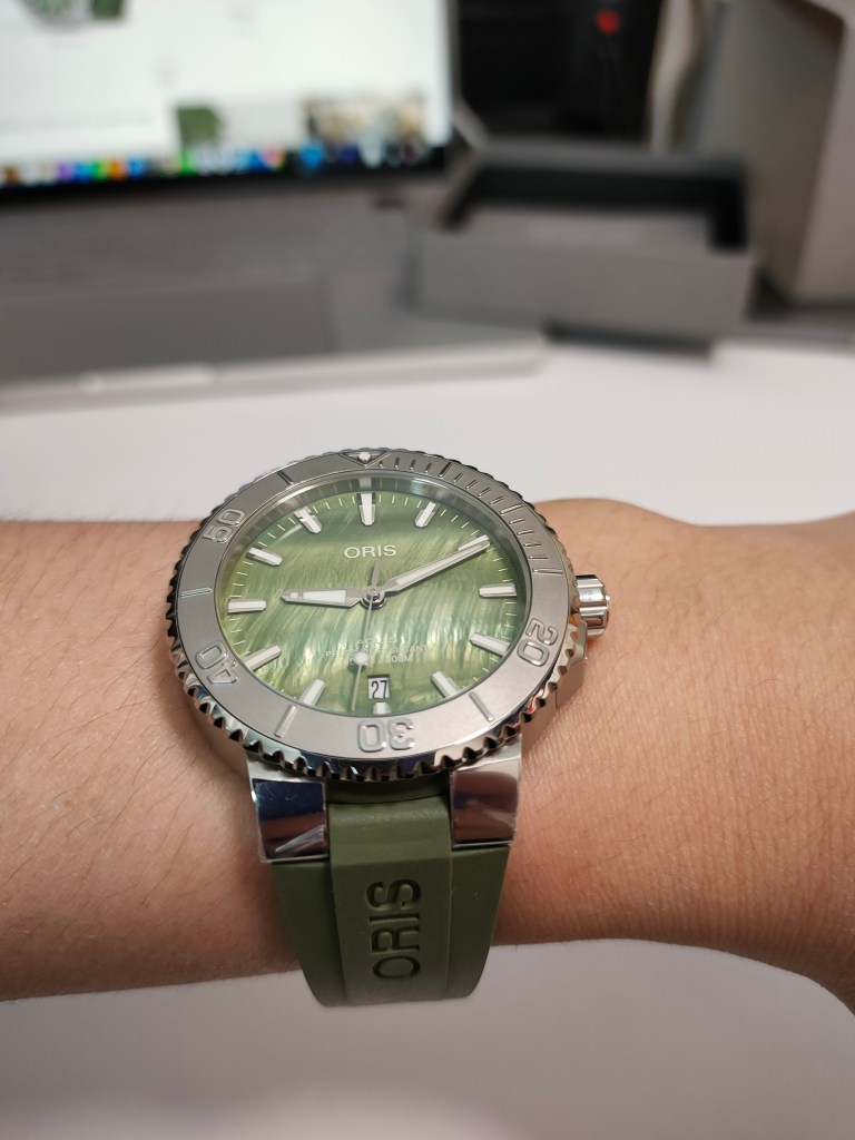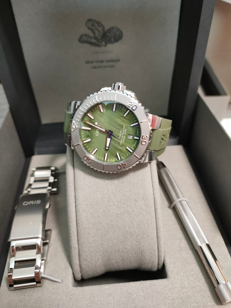 本來都無乜留意Oris,不過上次買隻G-Shock 既時候走去碌時間廊個Facebook,無意間發現呢隻 Aquis New York Harbor Limited Edition,不銹鋼錶殼,加呢隻珍珠貝面淺錄色,最重要係襯埋條綠色膠錶帶,係意想不到咁配合!