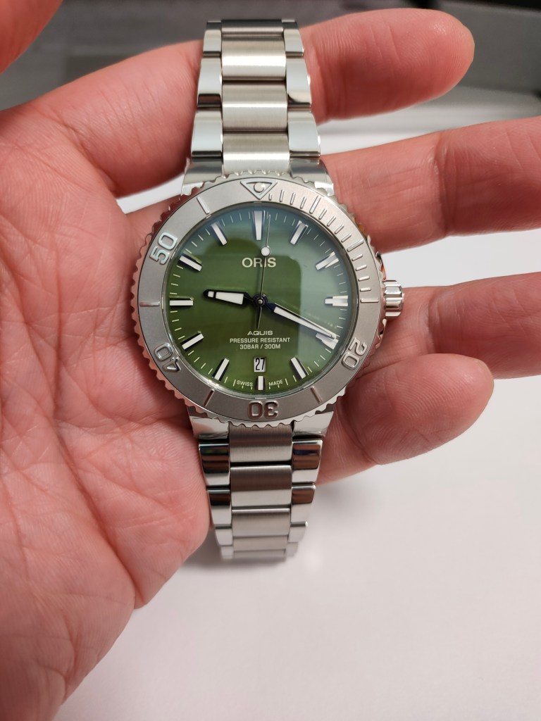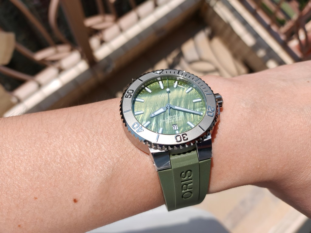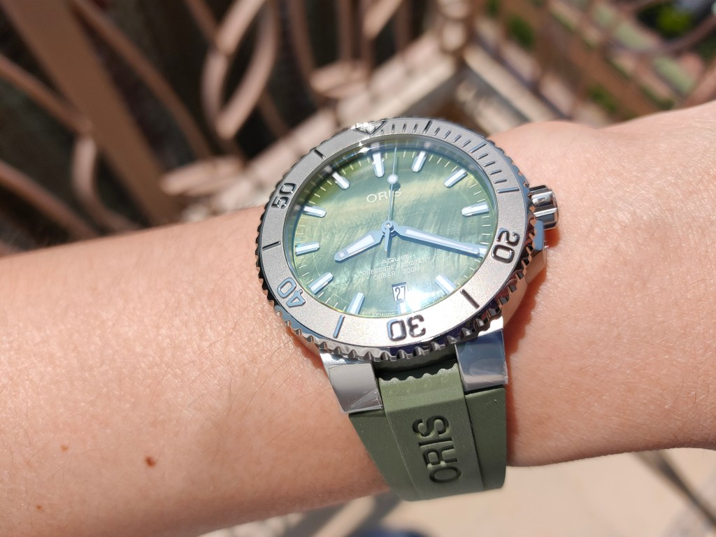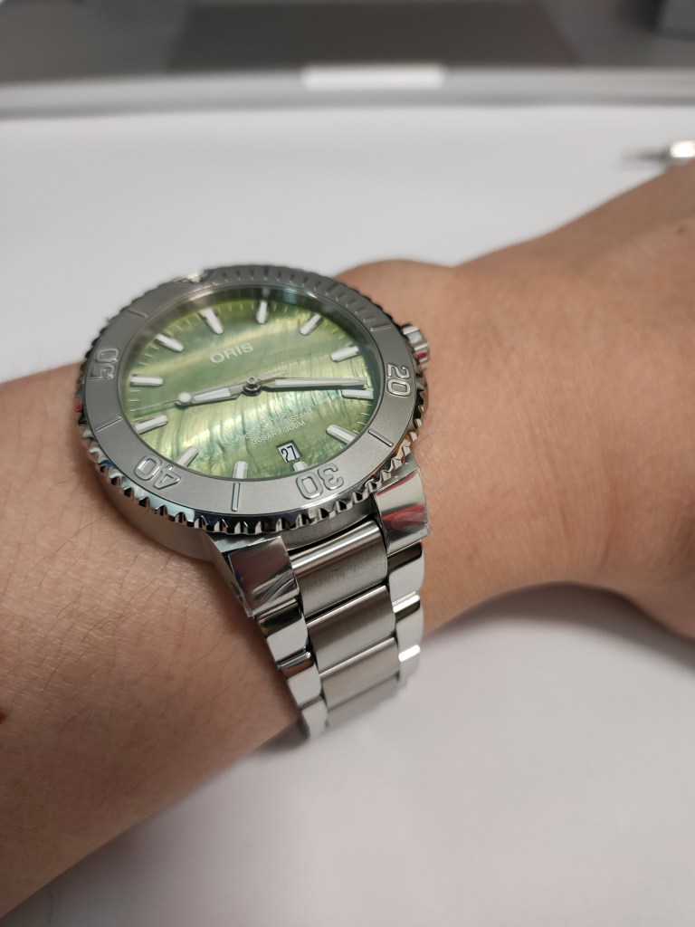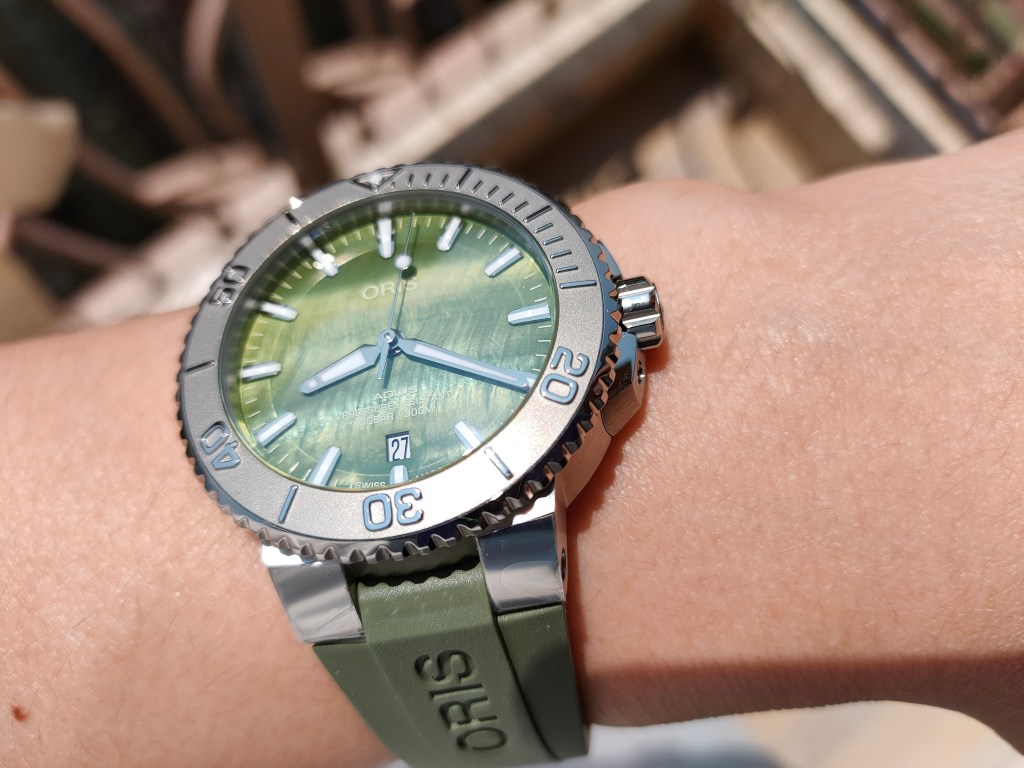 本來都無乜留意Oris,不過上次買隻G-Shock 既時候走去碌時間廊個Facebook,無意間發現呢隻 Aquis New York Harbor Limited Edition,不銹鋼錶殼,加呢隻珍珠貝面淺錄色,最重要係襯埋條綠色膠錶帶,係意想不到咁配合!